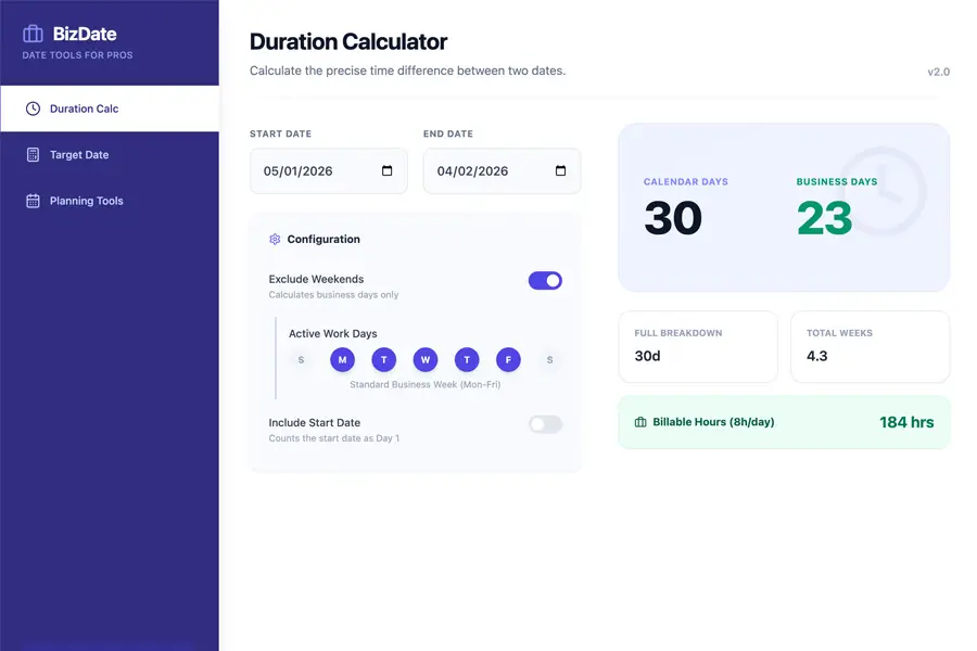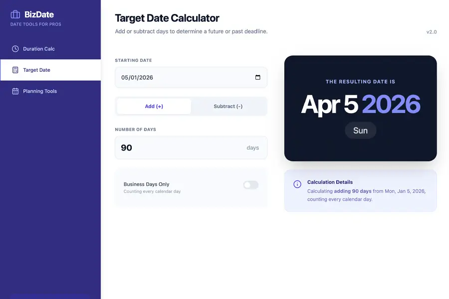 Calculate important business dates like deadlines, promo durations, warranties, and reminders. Quickly see exact date differences without manual counting.