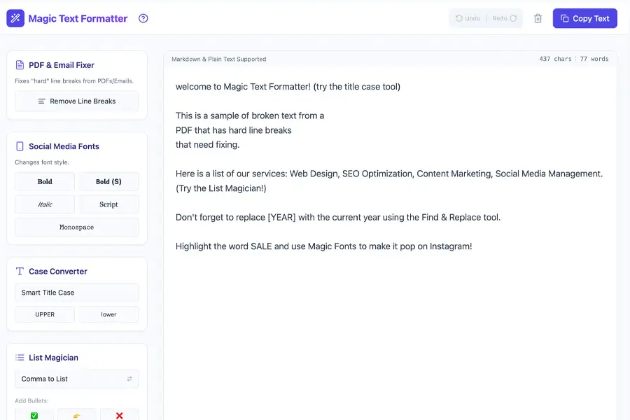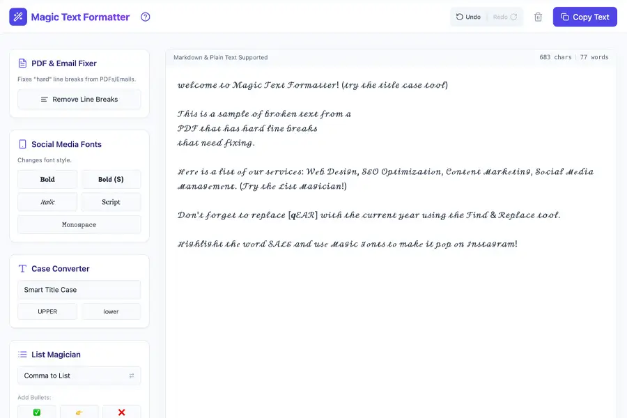 Turn plain text into clean, readable, and well-structured content for social media posts. Fix spacing, line breaks, and formatting with one click.
